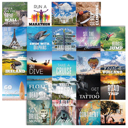 Bucket List Scrapbook Paper is 12X12" and double sided. Order more than one to use both sides. Perfect for your cruise scrapbook, sky diving, hot air balloon rides, road trips and more!